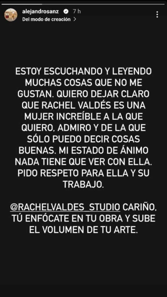 Luego de que varios medios españoles confirmaran la ruptura entre Alejandro Sanz y Rachel Valdés, varios usuarios señalaron que la artista es la principal razón por la que el cantante está pasando por un mal momento. Debido a ello, el inérprete de ‘Amiga mía’ salió a defenderla a través de sus redes sociales.