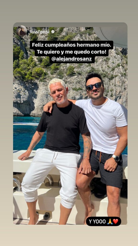 Luis Fonsi no podía quedarse atrás y también compartió en sus historias una instantánea en la que se ve abrazando a su amigo Alejandro Sanz, al parecer estarían disfrutando de un día de sol en un yate.